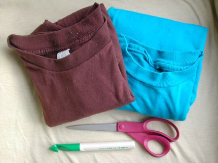 O primeiro passo é recortar as roupas em tiras, formando uma espécie de “linha” grossa.