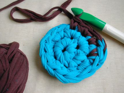 Após fazer isso com várias tiras, começe a fazer crochê usando a agulha gigante. Vá fazendo o crochê no formato que você desejar para formar o tapete. Pode servir não só como tapete, mas para qualquer outro fim que você desejar.